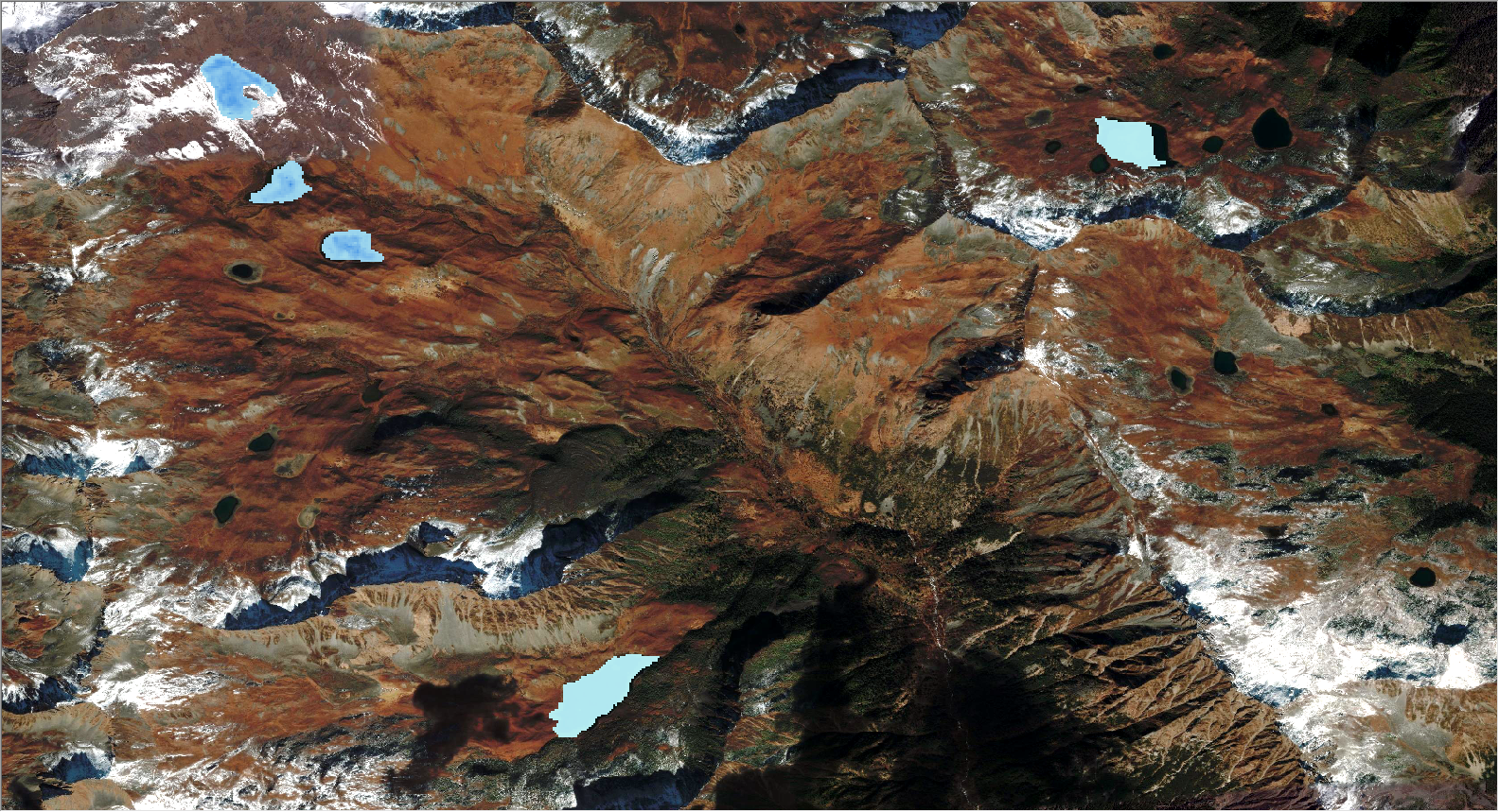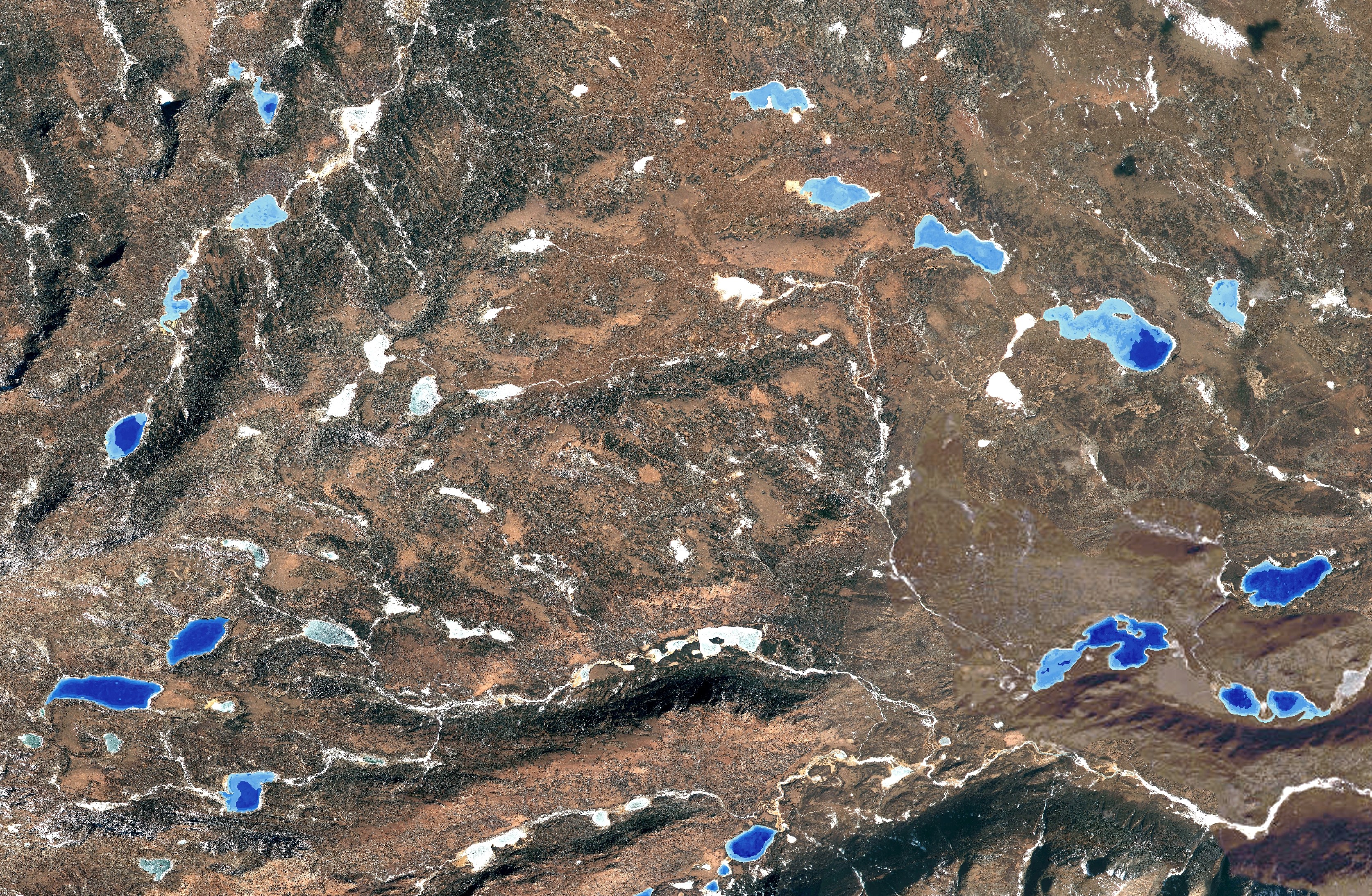 AI计算的湖泊水深叠加卫星遥感影像,湖泊蓝色深浅表示湖泊的深浅。